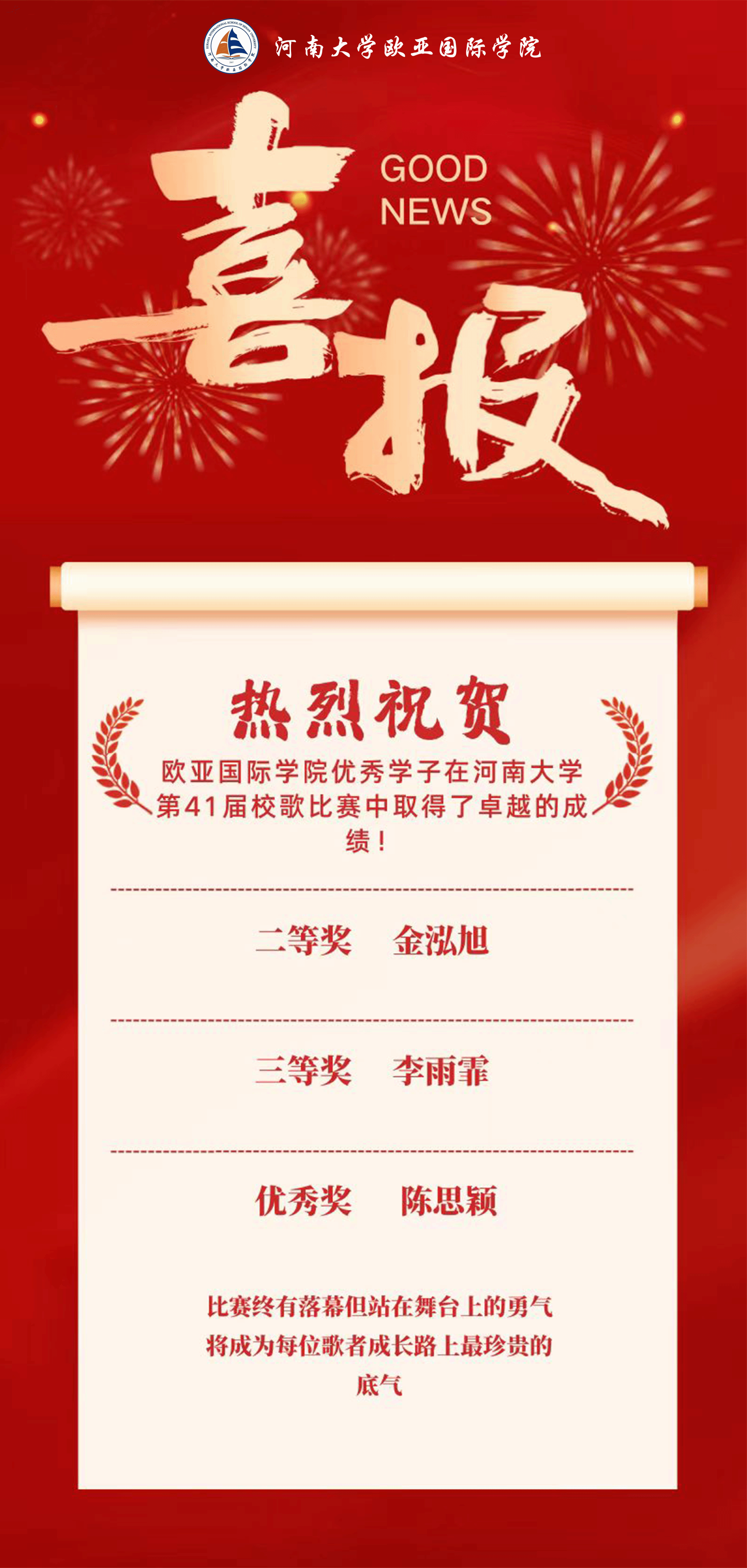 音符暂落,余韵悠长。此次佳绩是我院注重美育育人、鼓励学生多元发展的成果体现。未来,欧亚国际学院将继续鼓励更多同学在各类舞台上展现自我、追逐梦想,让青春之歌在更广阔的天地回响!