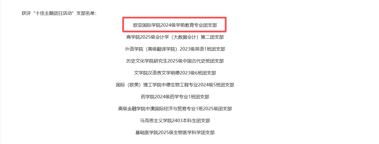 此次获奖,是欧亚国际学院团委持续深化青年思想政治引领、系统推进基层团组织建设成效的集中体现。下一步,学院团委将以此为新起点,进一步强化示范引领和成果转化,不断提升基层团组织的凝聚力、组织力和服务大局能力,团结引领广大团员青年在服务国家战略和学校高质量发展中挺膺担当、贡献青春力量。