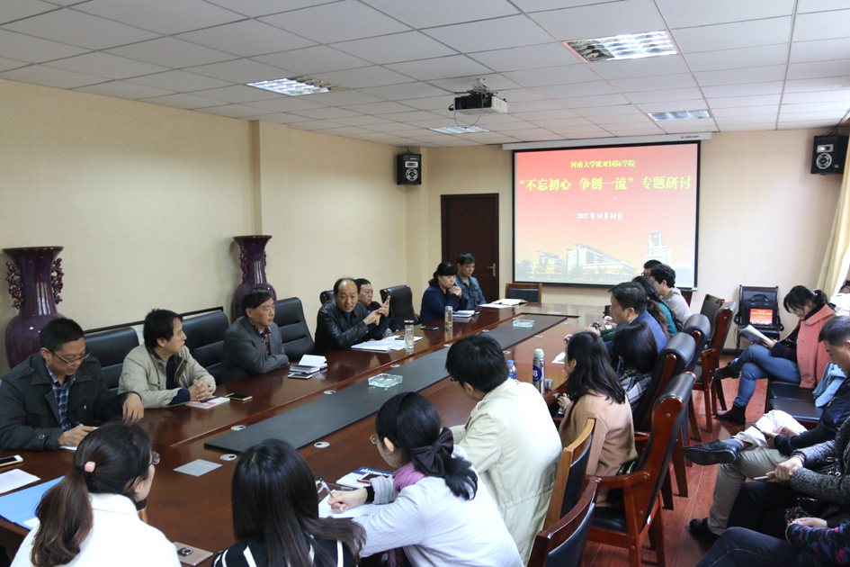 2017年10月19日下午,欧亚国际学院召在学院三楼会议室举行“不忘初心、争创一流”专题研讨会,学院全体教职工参与研讨,学院党委书记谷跃峰主持研讨。
