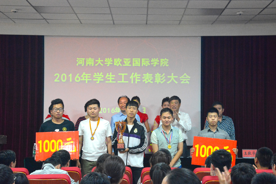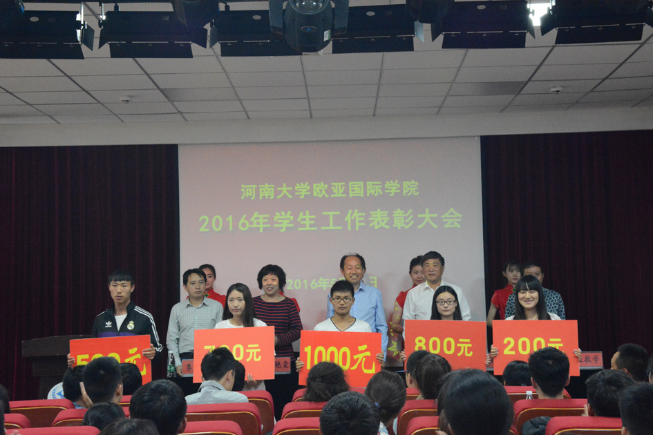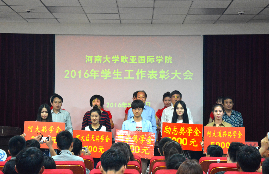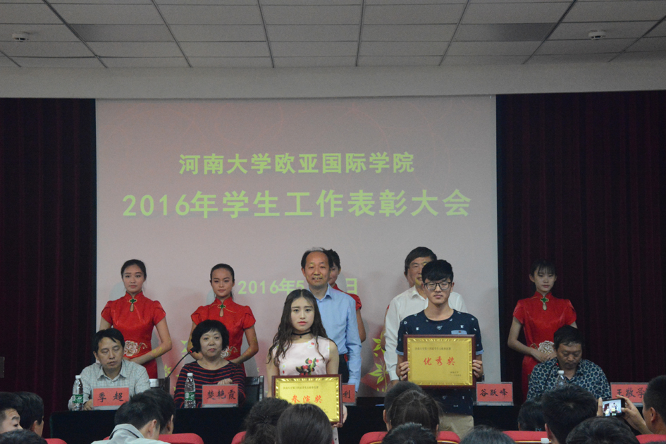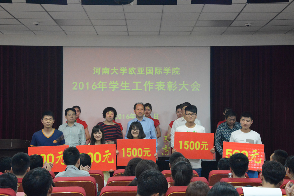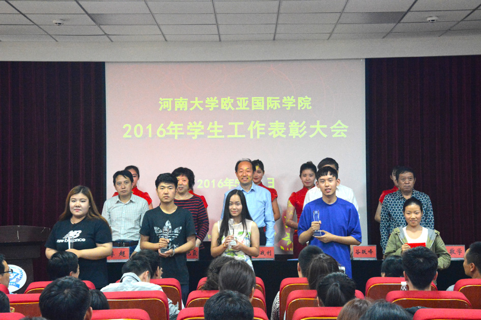 为倡树典型,凝聚士气,推进学生工作,2016年5月19日下午,欧亚国际学院在学院二楼报告厅举行2016年学生工作表彰大会。学院领导宋战利、谷跃峰、楚艳霞、王敬学、季超出席,获奖学生代表、各班级学生代表150余名参会,学院副院长王敬学主持表彰大会。