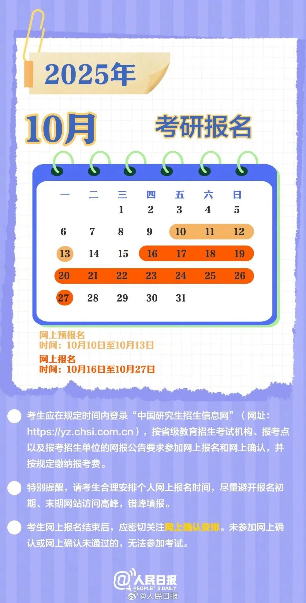 10月10日起开始预报名,考生可登录“全国硕士研究生招生考试网上报名平台”(网址:https://yz.chsi.com.cn)完成报名操作。请大家提前准备好个人相关材料,合理规划报名时间,确保报名流程顺利完成。