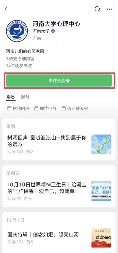 1.先搜索“河南大学心理中心”微信公众号,点击“关注公众号”。