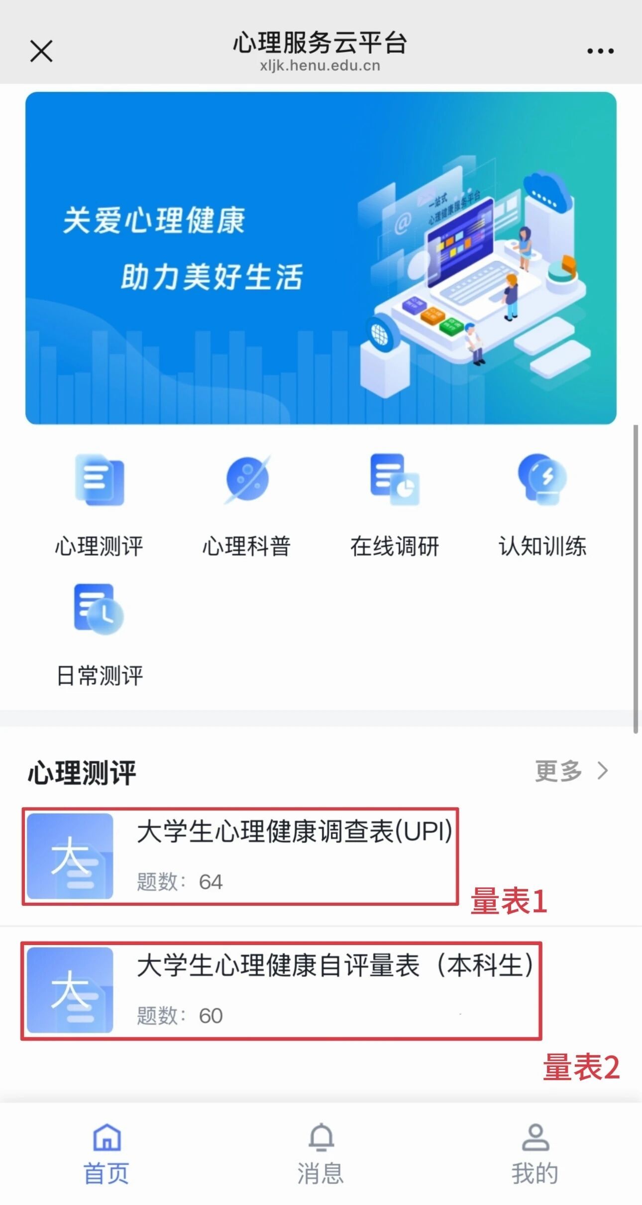 2.关注成功后,进入消息界面,点击菜单栏里的“心理测评”,记得根据自己使用的设备来选择相应端口哦~