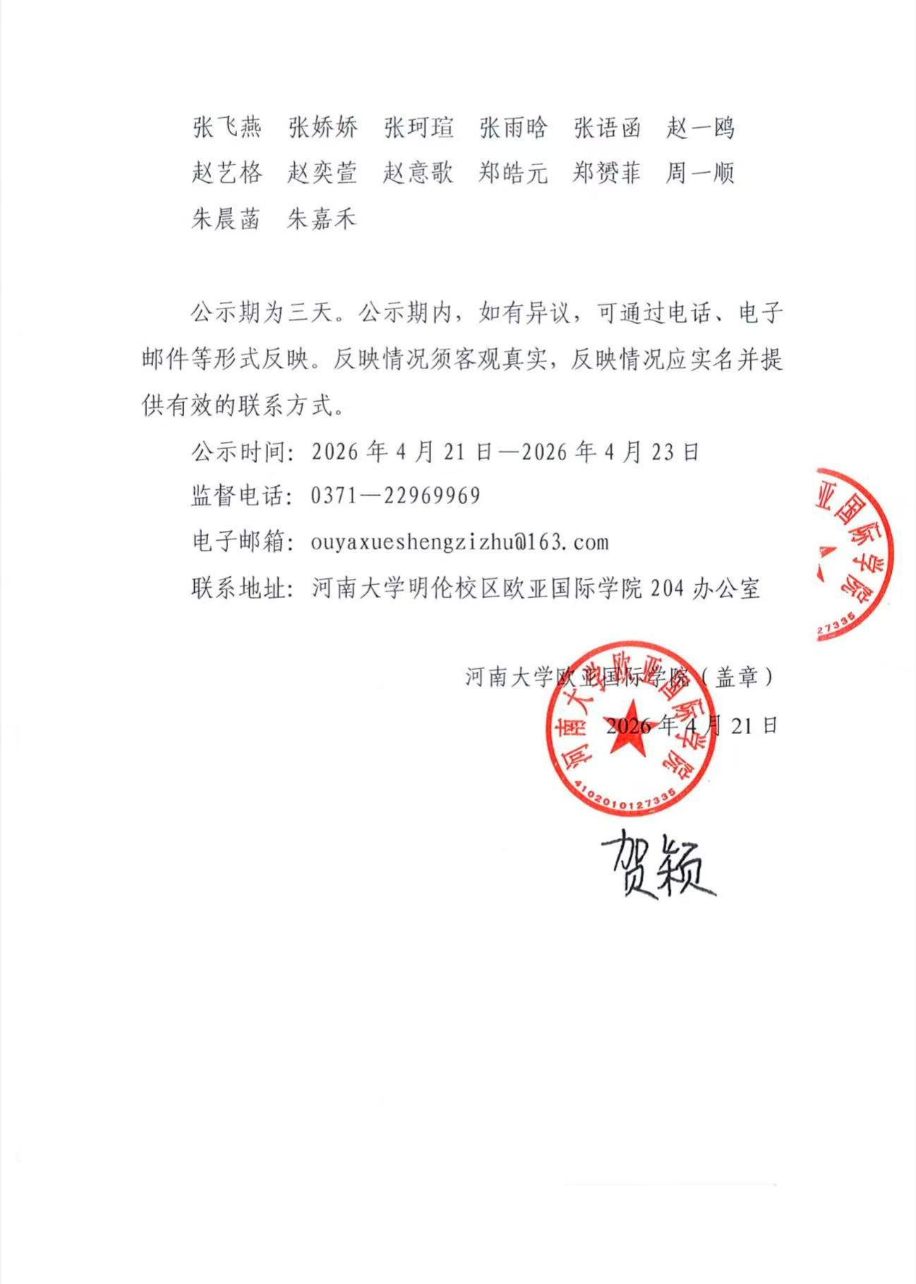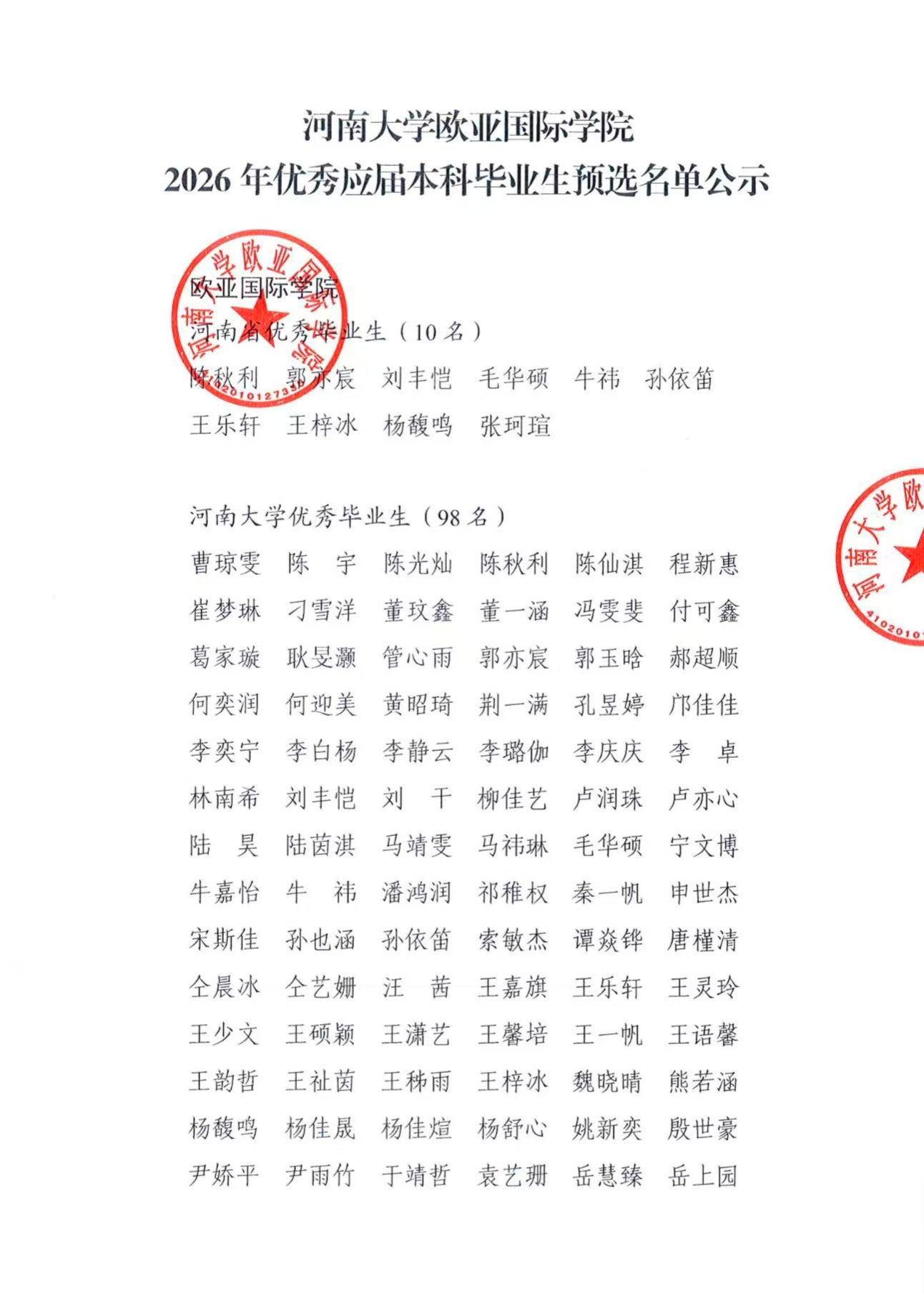 河南大学欧亚国际学院2026年优秀应届本科毕业生预选名单公示