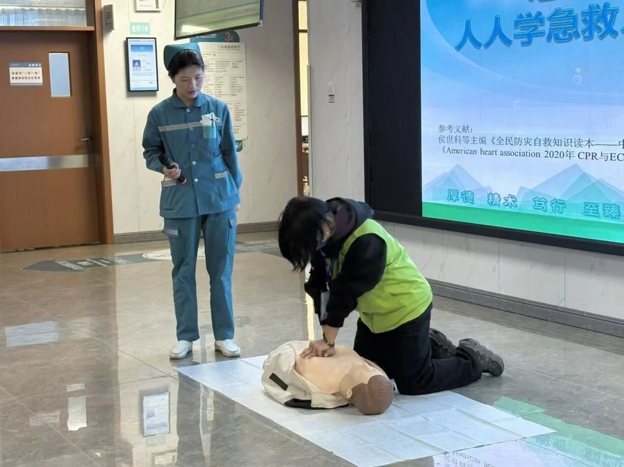 紧接着,医护人员分步示范心肺复苏的标准流程:从环境安全评估、意识与呼吸的快速判断,到呼救并获取AED、胸外按压、开放气道、人工呼吸的完整操作,明确了按压部位(两乳头连线中点)、深度(5-6厘米)、频率(100-120次/分钟)等核心参数。示范后,志愿者们分组在模拟人模型上进行实操练习,医护人员逐一指导规范动作,帮助大家精准掌握操作细节。