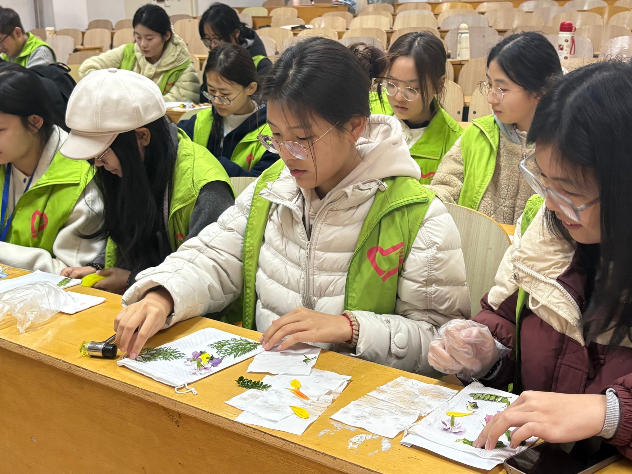 志愿者们共同学习拓印技巧——叶片摆放、捶打力度、纹理显色……从理论到实操,大家一起解锁拓印创作的核心密码,记录校园里春天的足迹。