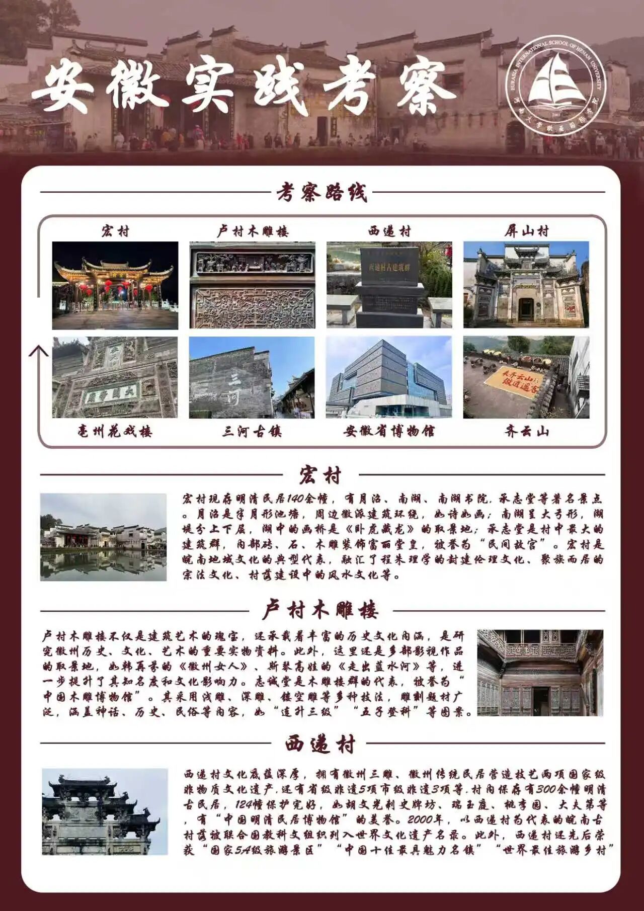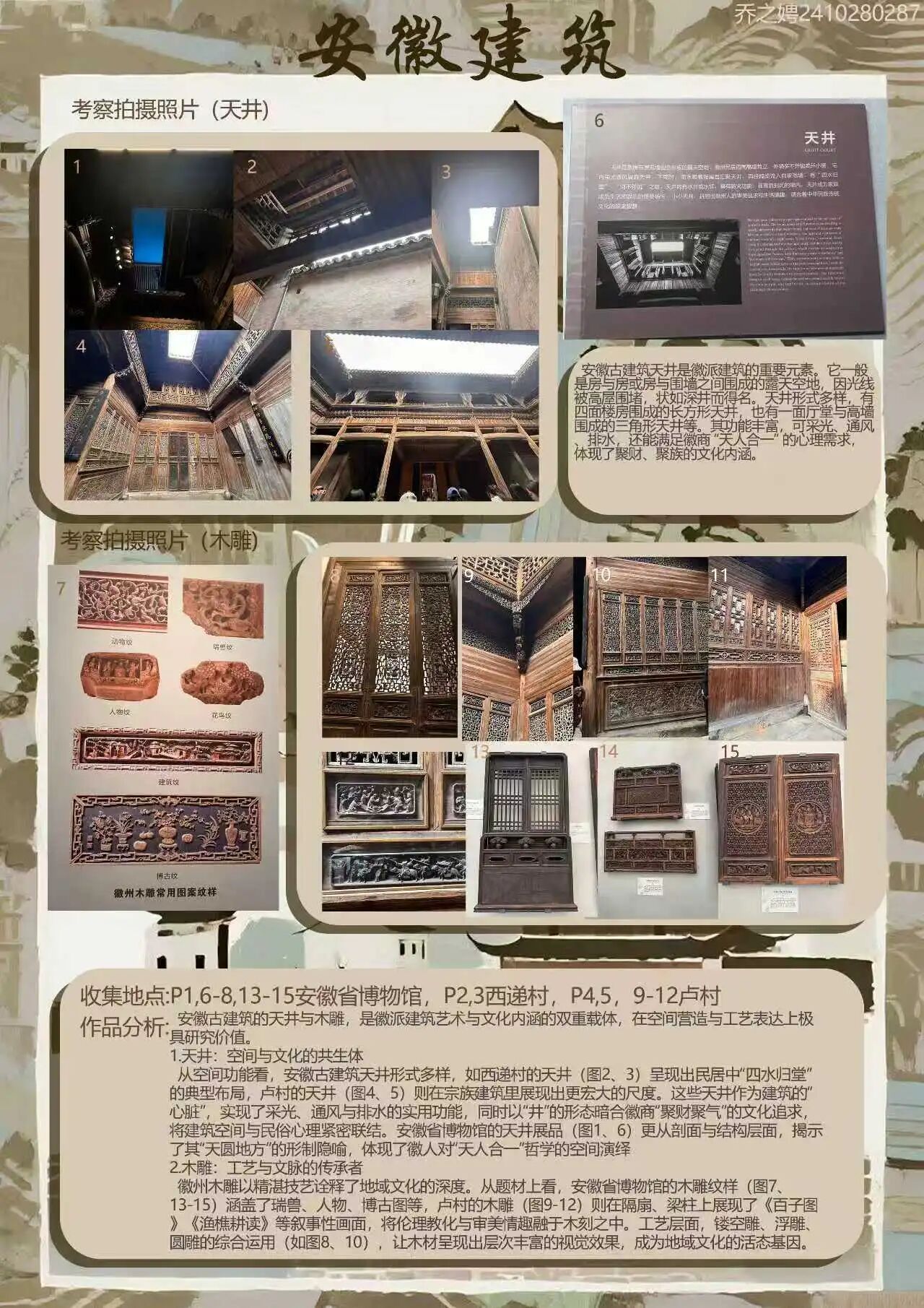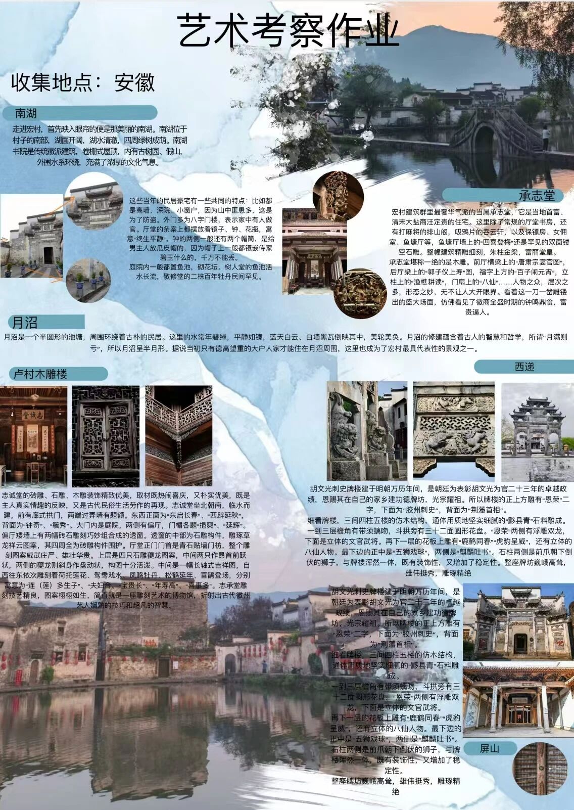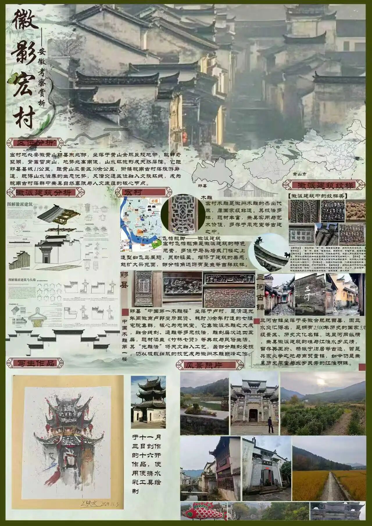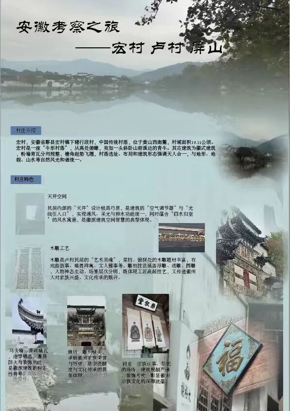 为探寻时光深处的文明印记,欧亚国际学院2024级视觉传达设计专业学生走进安徽的青山绿水与古老街巷。这是一次融合历史感知与自然体悟的行走课程,在徽州古道白墙黛瓦的村落间,同学们用专业视角重新解读这片土地,他们用画笔与镜头,记录下一个个触动心灵的瞬间。现将考察期间优秀学生作品进行展示(作品不分先后,因客观条件限制,未能将所有作品进行展出)。